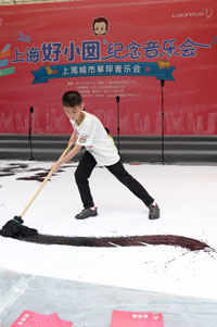 來自好小囡四大團(tuán)隊(duì)之一的好小囡萬能雙手俱樂部的代表---12歲的喻文添小朋友的巨型書法表演,將整場音樂會(huì)推向了高潮。在鋼琴獨(dú)奏《閃閃紅星放光彩》的旋律中,喻文添拿起巨筆,寫下了四個(gè)剛勁有力的毛筆字——自強(qiáng)不由息,相得益彰的精彩表演,贏得了全場喝彩。