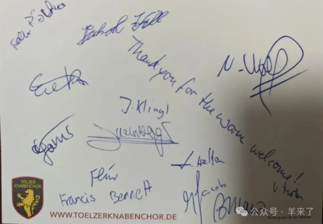 演出結(jié)束后,托爾策童聲合唱團(tuán)的團(tuán)長(zhǎng)特意送上了珍貴的禮物——一份由全團(tuán)所有團(tuán)員、指揮和鋼琴伴奏老師親筆簽名的紀(jì)念品。這份真摯的情誼,是兩國童聲合唱團(tuán)之間深厚友誼的見證。好小囡少兒合唱團(tuán)代表也回贈(zèng)了精心準(zhǔn)備的彩羊和T恤衫,表達(dá)了最誠摯的感謝。