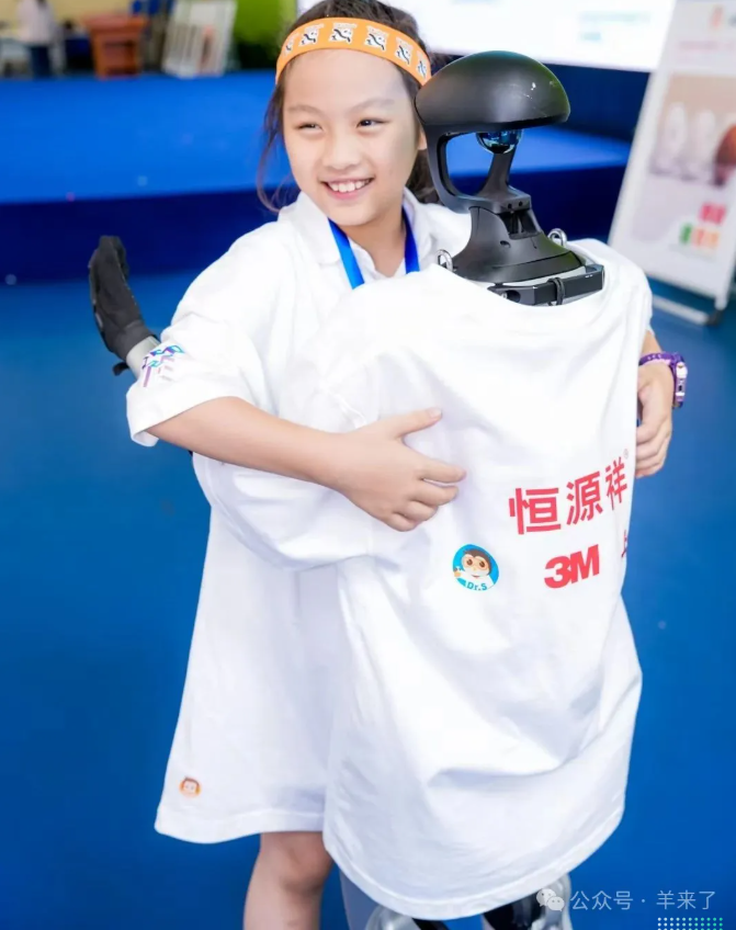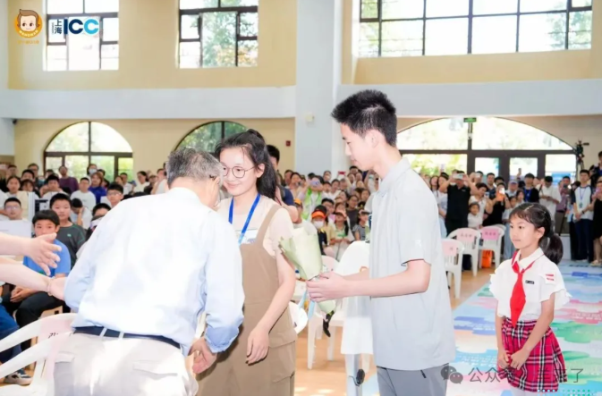 88 歲的沈?qū)W礎(chǔ)院士與上海民辦平和中學(xué)吳金軒,上海外國語大學(xué)浦東外國語學(xué)校陳圣朵,上海北郊學(xué)校袁韓梓和宇樹科技機器人等共同點亮水晶球的瞬間,成為賽事啟動儀式的高光時刻。孩子們向院士獻上恒源祥非遺技藝制作的絨線玫瑰,象征科技與人文的代際傳承;宇樹科技的機器人作為特殊嘉賓參與儀式,科技感與童趣在此碰撞。