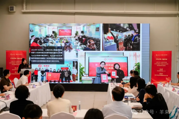在黨建聯(lián)建成果介紹環(huán)節(jié),國油版雕黨支部、建筑系黨支部、設(shè)計系黨支部分別展示了黨建工作中的創(chuàng)新實踐。通過生動的合作案例,展示了在學(xué)科交叉、技術(shù)融合、美育輻射、美育浸潤、人才培養(yǎng)等方面,黨建工作與專業(yè)特色深度融合的共建成果。其中,也呈現(xiàn)了自2024年1月上海大學(xué)美術(shù)學(xué)院黨委與恒源祥集團(tuán)黨委簽署黨建共建協(xié)議以來,雙方就藝術(shù)設(shè)計、非遺轉(zhuǎn)化、海派融合等方面進(jìn)行的探討與創(chuàng)新實踐。