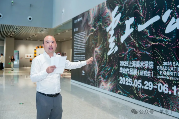 會后,上海美術(shù)學(xué)院黨委副書記、副院長曹俊為與會嘉賓導(dǎo)覽了“云上一公里”2025上海美術(shù)學(xué)院畢業(yè)作品展。