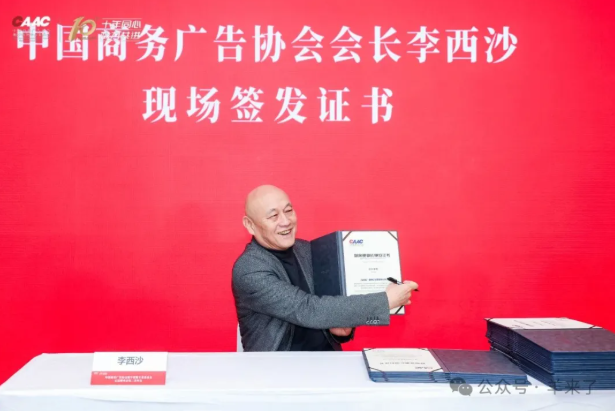 在第六屆理事會(huì)副理事長單位、聯(lián)席理事長單位選舉產(chǎn)生后,中國商務(wù)廣告協(xié)會(huì)會(huì)長李西沙現(xiàn)場進(jìn)行了簽字并頒發(fā)證書。