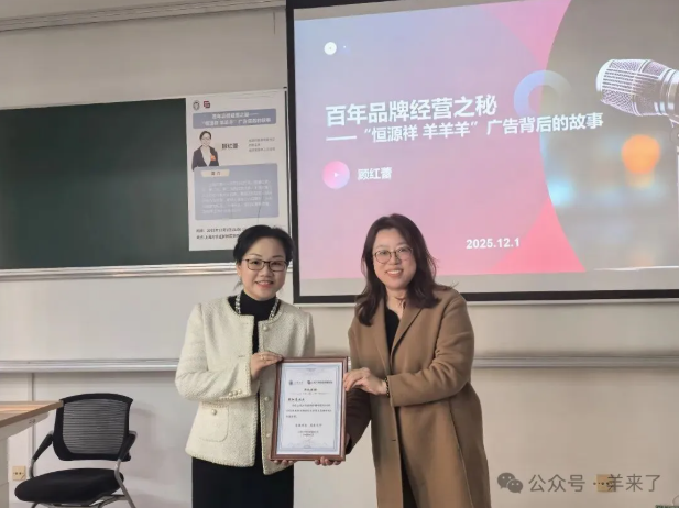 12月1日,作為“百年育人聯(lián)盟”成立后,百年高校與百年品牌攜手共創(chuàng)的“傳承歷史文脈 培育時(shí)代新人”系列的首場(chǎng)活動(dòng),恒源祥集團(tuán)黨委書記、組織發(fā)展中心總經(jīng)理顧紅蕾走進(jìn)上海大學(xué)新聞傳播學(xué)院,為學(xué)生們講述了《百年品牌經(jīng)營(yíng)之秘——“恒源祥 羊羊羊”廣告背后的故事》。