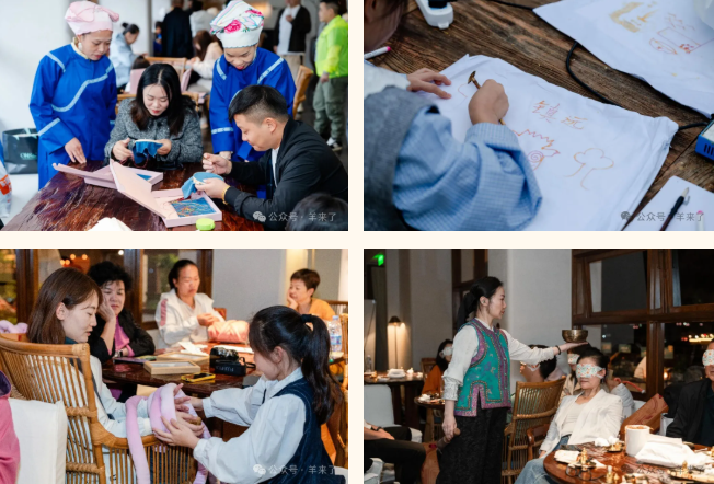 活動現(xiàn)場,非遺體驗成為一大吸睛的環(huán)節(jié)。恒源祥聯(lián)合貴州省婦聯(lián)的非遺從業(yè)人員,將苗繡、蠟染等當?shù)靥厣止ぜ妓嚢徇M“睡前一小時”場景。在古城民宿的溫馨空間里,參與家庭放下電子設備,有人專注勾勒苗繡紋樣,讓傳統(tǒng)圖騰在指尖綻放;有人耐心浸染蠟染布料,看著藍白交織暈染出獨特肌理;有人和孩子共同協(xié)作,用冰島線編織著抱枕。這些需要高度專注的手工活動,不僅能驅(qū)散白日雜念、舒緩神經(jīng),契合恒源祥“自然助眠”的理念,更讓參與者在一針一線中感受非遺的魅力,為睡前時光賦予文化溫度。