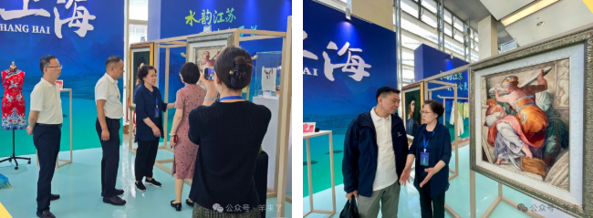 17日,重慶市市委書記袁家軍、文化和旅游部非遺司沿長江領域13省市區(qū)文化和旅游廳局相關代表、上海市文旅局非遺處副處長郁文昌前來觀看了上海絨繡,李薔老師向領導們介紹了絨繡作品,得到了領導的贊賞。