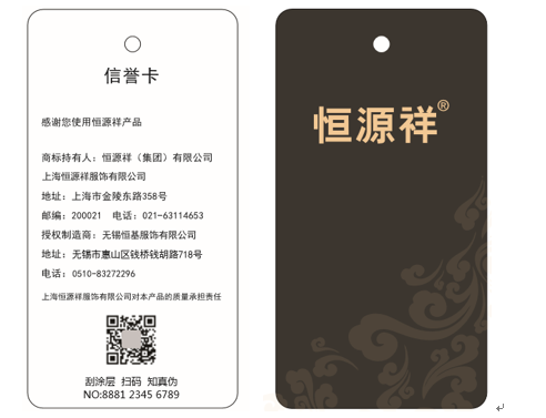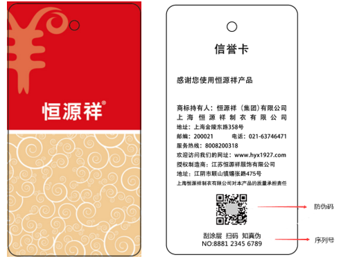 恒源祥服飾、毛針織、內(nèi)衣、家紡等品類產(chǎn)品已逐步更換全新的防偽信譽(yù)卡,用戶刮開信譽(yù)卡上的涂層,顯示出完整的二維碼,使用手機(jī)微信掃一掃,即可查詢驗(yàn)證真?zhèn)?,請認(rèn)準(zhǔn)頁面域名http://cj8.ren或http://fz.cj8.ren開頭的網(wǎng)址,查詢答復(fù)內(nèi)容如下: